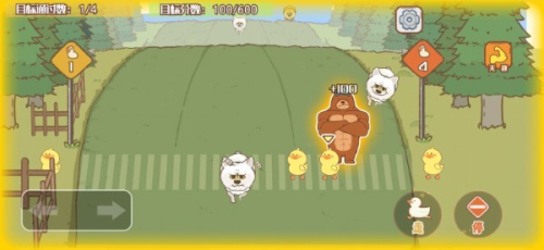 1、基础玩法是控制大鹅左右移动,保护一群小鸭子安全穿越马路,同时要躲避来往车辆和潜伏的大灰狼,确保所有小鸭子安全到达对面。