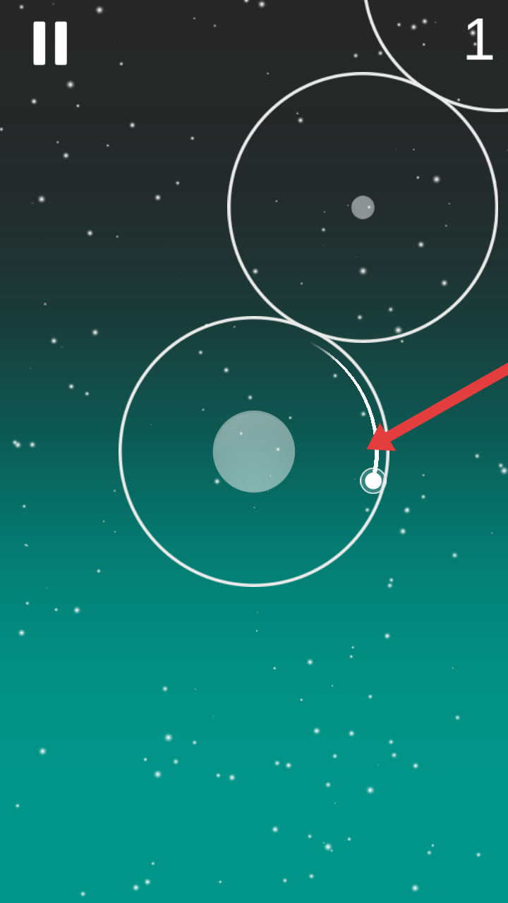 2、操控白色小球沿轨道绕中心天体运动,保持小球始终在白色圆环区域内穿梭,规避边界碰撞,右上角数字为当前积分。