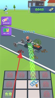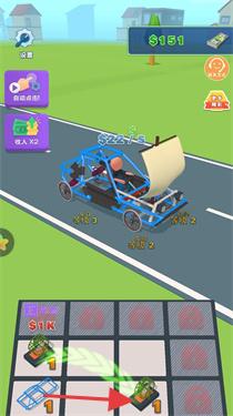 2、行驶中,按红色箭头提示,收集道路上的资源(如棕色物件),用于升级或解锁新部件。