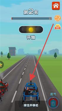 3、进入竞速模式,在“开始”信号灯处,按住并拖动蓝色赛车,操控其在道路上加速冲刺,争取名次。