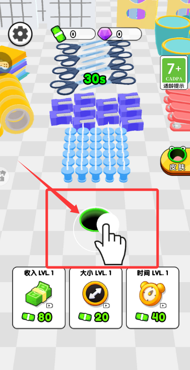 1、开启游戏,点击滑动操控黑洞,在规定时间内让黑洞吞噬各类物品。
