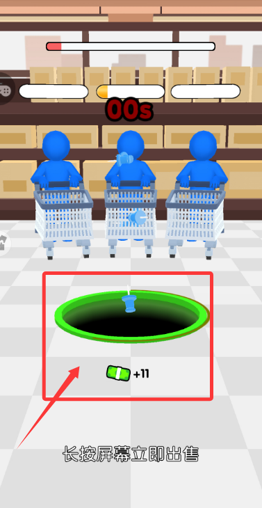 2、在游戏中操控黑洞吸附货架商品、购物车等,长按屏幕可快速出售物品获取奖励。