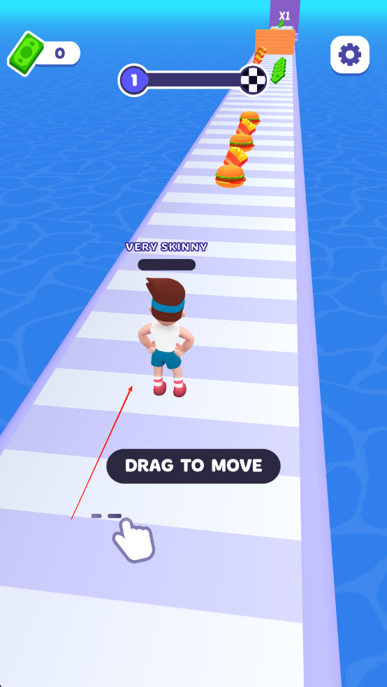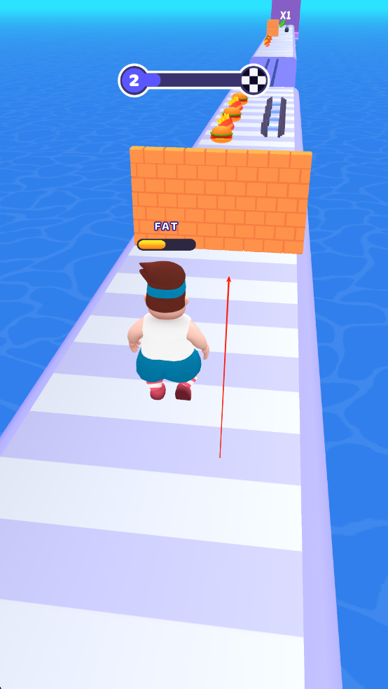 1、进入游戏后滑动屏幕操控吃货小人左右移动,开局优先收集赛道左侧的汉堡等美食,快速积累体型变胖所需的能量值。