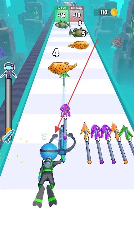 1、水下跑酷创新:区别于陆地跑酷,潜水员的移动受水流阻力影响,需通过划水动作改变方向,搭配鱼枪射击,打造独特的水下闯关体验。