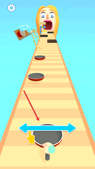 1、操作启动:滑动控制平底锅,在跑道承接洒落的玉米粒。