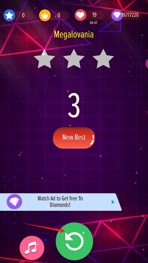 3、成长系统:通过完成游戏获得经验值提升等级,解锁新曲目与特效,使用星星购买基础升级,钻石可购买高级曲目与加速成长,支持观看广告免费获取随机资源。
