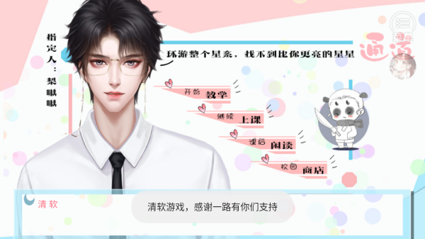 1、进入指定角色【梨啾啾】的互动界面,可选择【开始教学】开启新环节,【继续上课】推进剧情,【课后闲谈】交流互动,或进入【校园商店】兑换道具。