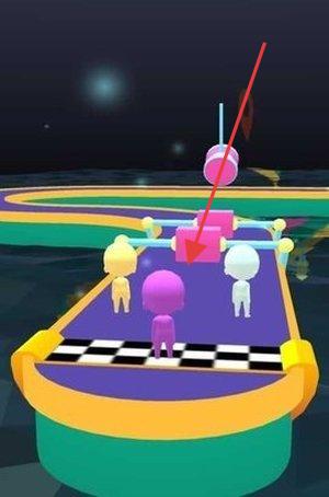 1、在起始赛道,操控紫色角色,按箭头指引,躲避粉色障碍,与其他角色一同开启跑酷。
