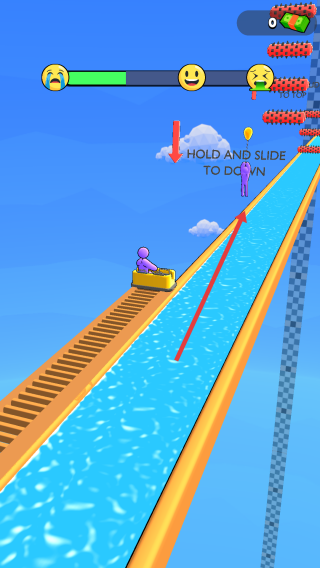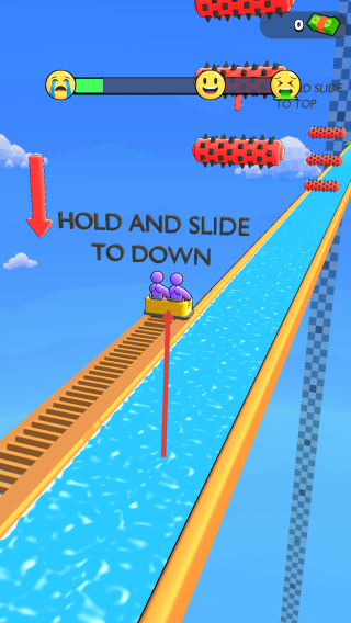 2、滑道操控:按住黄色小车,按“HOLD AND SLIDE TO DOWN”提示向下滑动,躲避滚轮障碍。