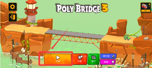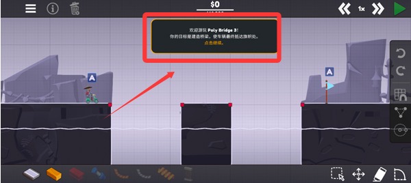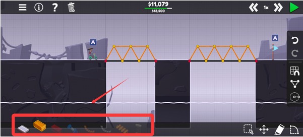 3、完成新手教程后就可以正式开始游戏了,我们需要使用左下方的材料搭建桥梁。