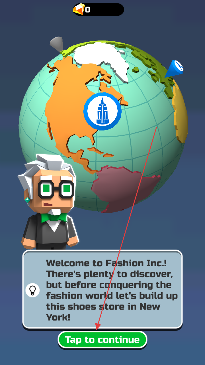 1、初始界面点击“Taptocontinue”,开启在纽约打造时尚鞋店的旅程,推进游戏流程。