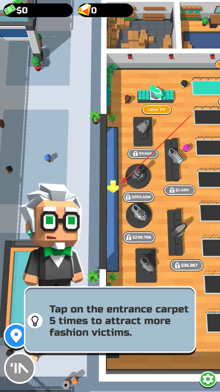 3、在鞋店场景,按提示点击入口地毯5次,吸引顾客,提升店铺人气,积累发展资源。
