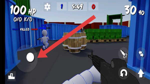 2、战斗中,用左侧虚拟摇杆(红箭头指向)移动角色,在集装箱场景走位,躲避敌人攻击。