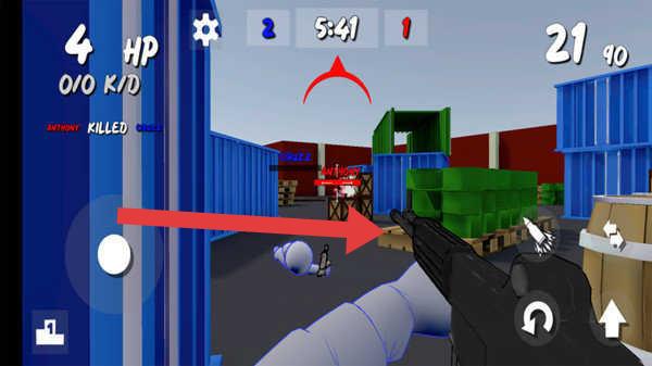 3、瞄准敌人(红箭头指向),点击射击按钮,消耗敌人血量,达成击杀,推进战局,提升K/D。