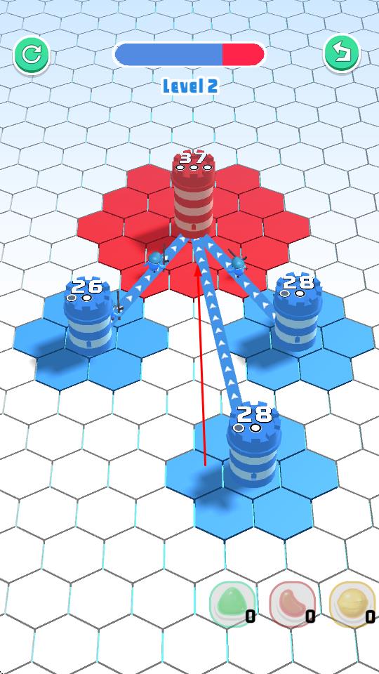 1、点击己方塔楼,派遣兵力沿路径移动,攻击并占领敌方塔楼,将其转化为己方,扩大控制区域。
