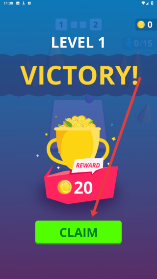 3、通关后,点【CLAIM】(红箭头指向),领取奖励(20金币),进入下一关(Level2)挑战。