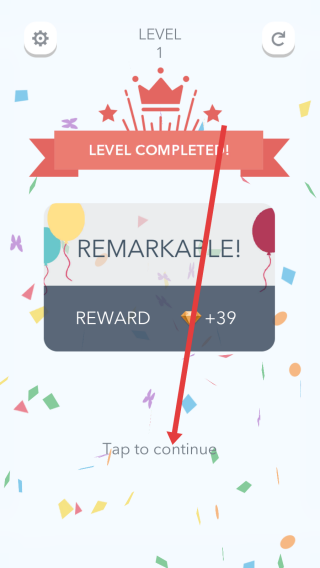 3、通关后,点“Tap-to-continue”(红箭头指向),领取奖励(+39钻石),进入下一关挑战。