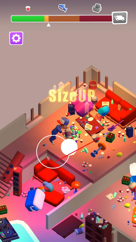 1、进入游戏后,在派对后的混乱场景中,操控角色开始收集垃圾,像滚雪球一样将分散的垃圾聚集起来。