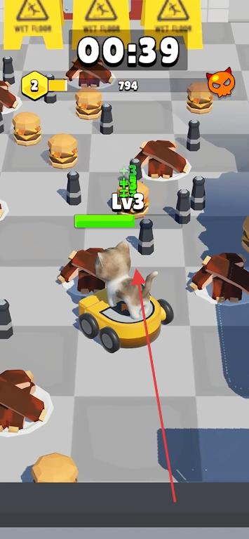 1、进入游戏操控猫猫车辆在棋盘地图移动,点击格子收集道具、机器人零件与升级点数,开启探索之旅。