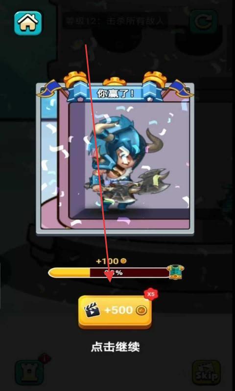 3、通关后,点击【点击继续】进入结算,或看广告点【+500】领奖励,积累金币用于英雄升级,推进下一关。