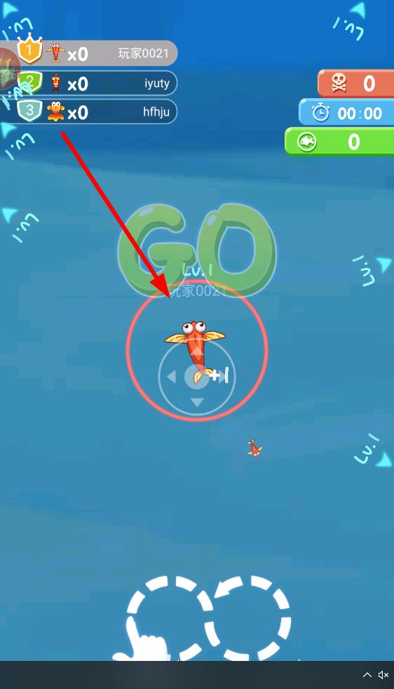 1、进入界面后滑动屏幕操控小鱼移动,靠近比自身小的鱼类触发自动吞噬,避开红色警示的大型掠食者。