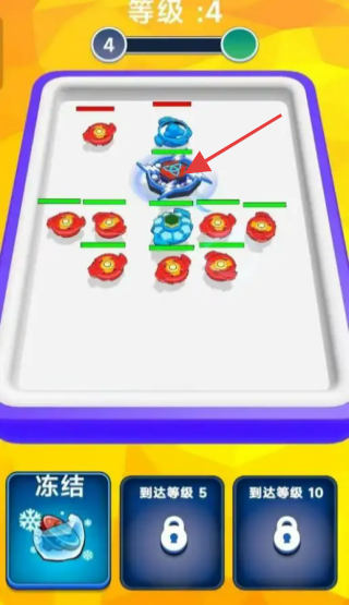 2、战斗中关注箭头指向的陀螺,可通过升级、技能释放等强化其战力,对抗敌方。