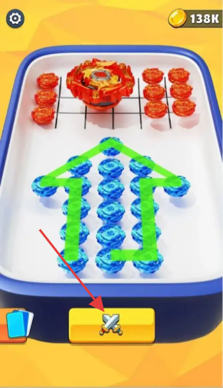 3、依据箭头路径,点击下方带交叉剑图标的按钮,调整蓝色陀螺阵型,优化战斗布局。