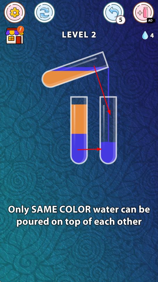 3、执行倒水操作:点击源试管,再点击目标试管,将源试管中的液体倒入目标试管,只有当目标试管顶部颜色与源试管顶部颜色相同,或者目标试管为空时,才能进行倒水操作。