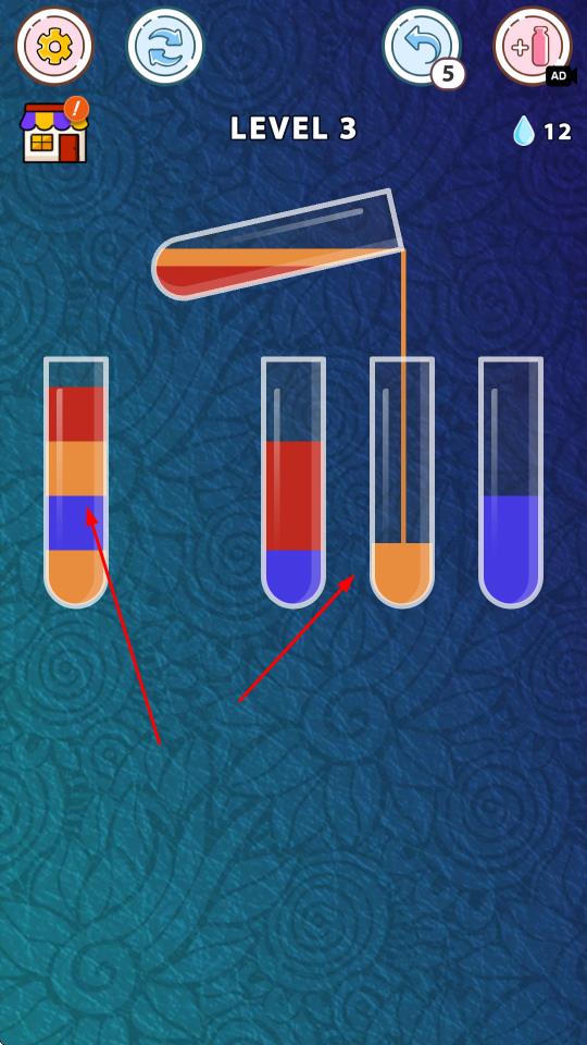 2、点击起始试管,将液体倒入目标试管,通过倒液调整液体分布,让每个试管最终仅含一种颜色。