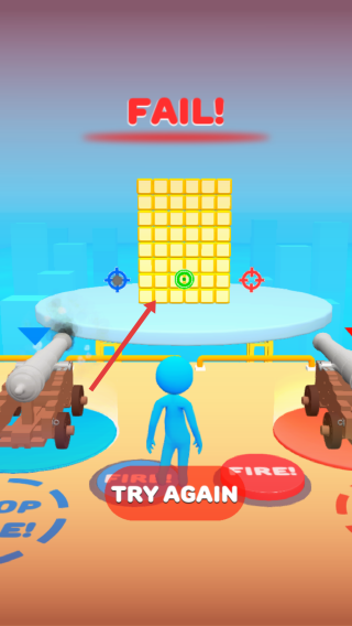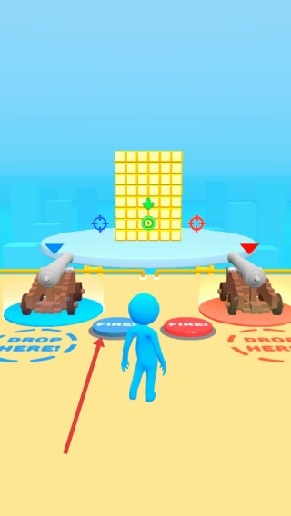2、操作炮台:操控蓝色角色移动到左侧蓝色“FIRE”按钮处,触发左侧炮台攻击。