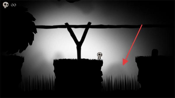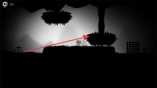 1、操控剪影小人,躲避草丛中尖刺陷阱,向右移动。