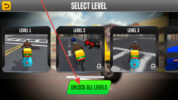 1、打开Delivery Rider游戏,点击主界面【START】,进入关卡选择,可点【UNLOCK ALL LEVELS】解锁全部关卡。