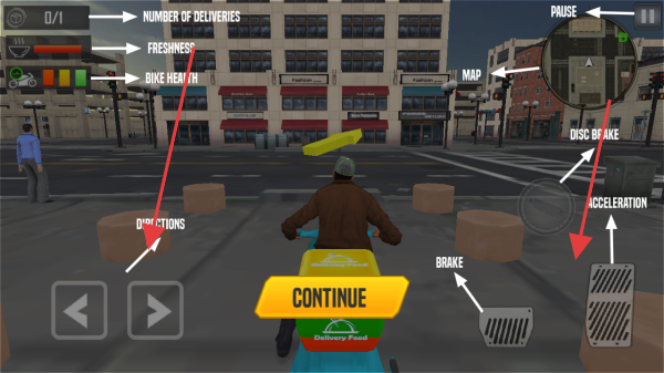 3、配送中,关注界面“DIRECTIONS”(方向)“BIKE HEALTH”(车辆状态)等提示,用刹车、加速键(底部按键)控速,完成订单。