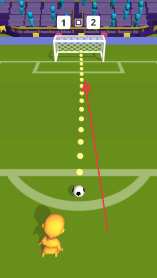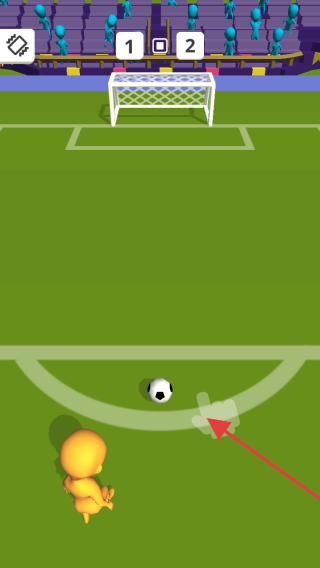 1、进入足球游戏,操控黄色小人,按住屏幕调整踢球方向和力度,瞄准球门,争取在比分【1-2】情况下扳回局势。