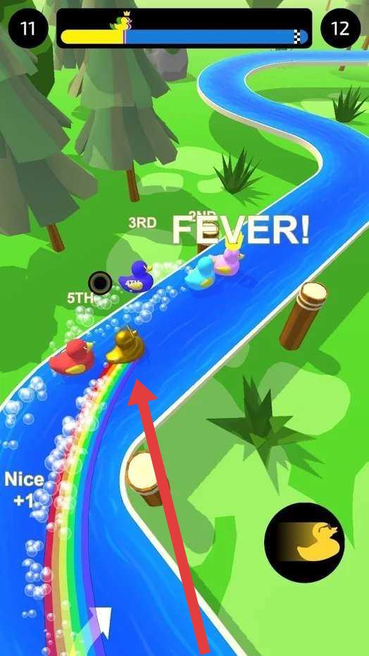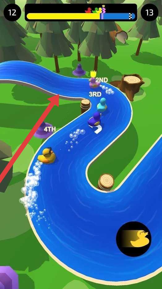 1、在河道赛道,操控小黄鸭,沿箭头方向,超越对手(2ND、3RD等),争夺竞速排名。