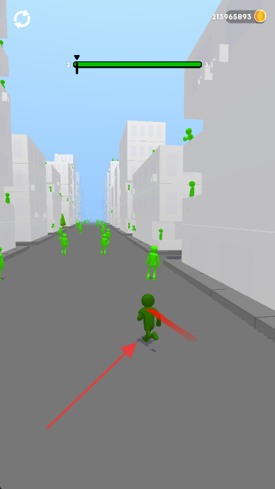 2、操控角色沿箭头方向奔跑,吸收沿途绿色小人,增强实力。
