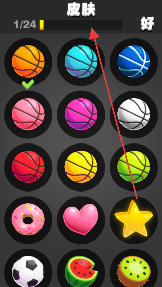 2、可在【皮肤】界面选择多样造型的篮球如彩色篮球、特殊形状道具等丰富游戏视觉体验。