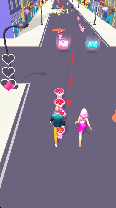 2、操控角色沿箭头方向奔跑,收集玫瑰,靠近粉色服装的目标伴侣。