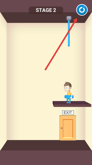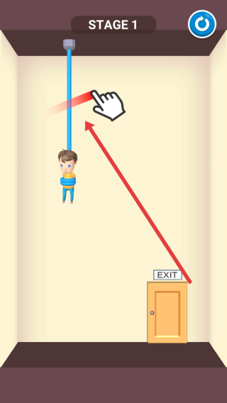 1、STAGE-1,点击箭头指向的蓝色绳索,切断绳索,让被困角色下落,尝试到达“EXIT”脱险。