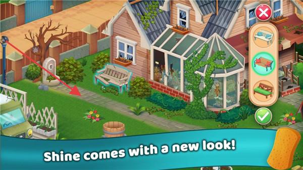 2、选择庭院改造道具,翻新房屋外观,布置绿植家具,赋予新面貌。