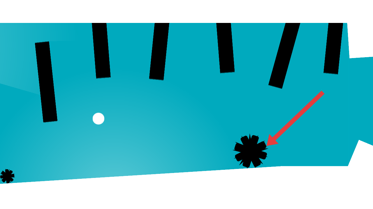 2、进入第二关后,注意屏幕中箭头指向的黑色尖刺障碍物,操控白球滚动时需精准避开这些危险区域,同时利用右侧安全区域的地形特点。