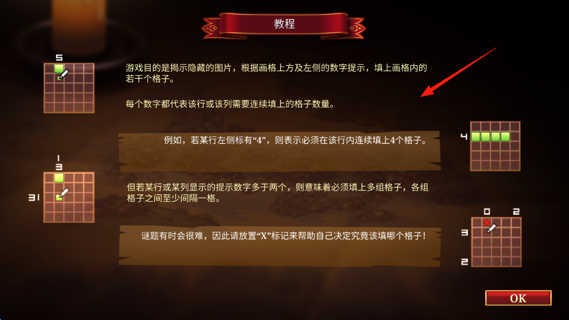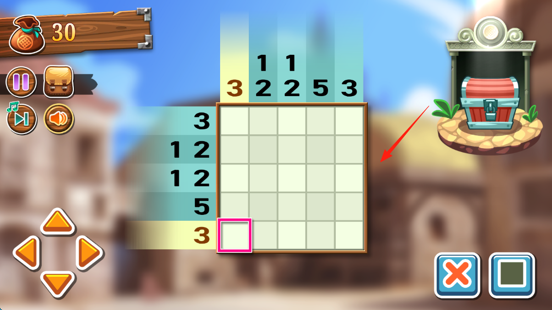 3、看行列数字,移动光标选格子填充,合并同色完成数字解谜。