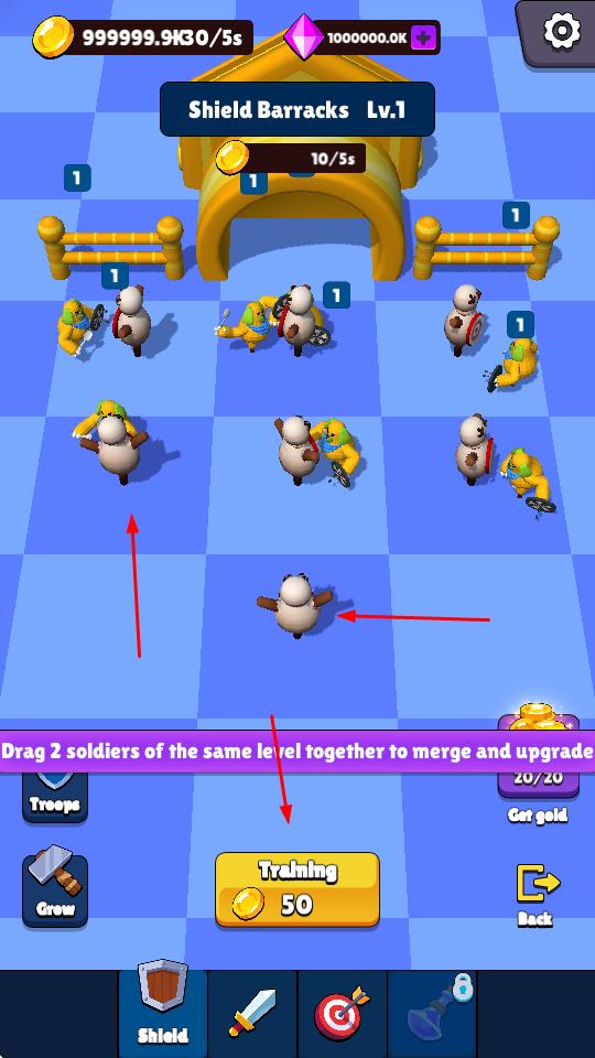 1、拖动2个同等级士兵,可合并升级,提升士兵属性,优化部队战力结构。