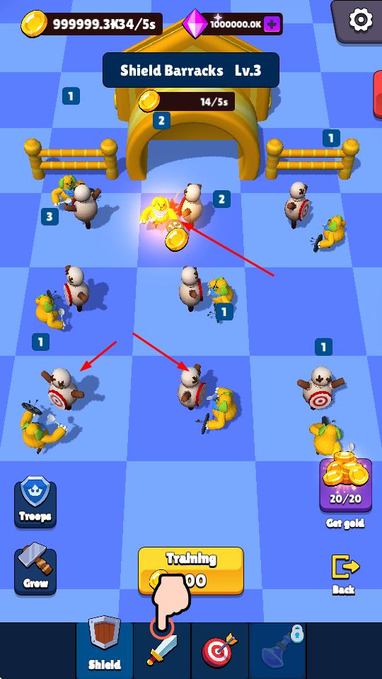 2、消耗金币点击“Training”,对士兵进行训练,增加士兵等级、数值,强化部队整体实力,应对更高难度战斗。