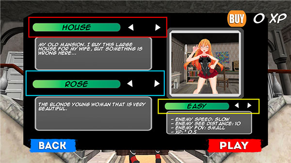 1、如下图,红框“house”可以切换场景地图,黄框“easy”可以调整游戏难度,蓝框“rose”可以切换不同形象的妻子。