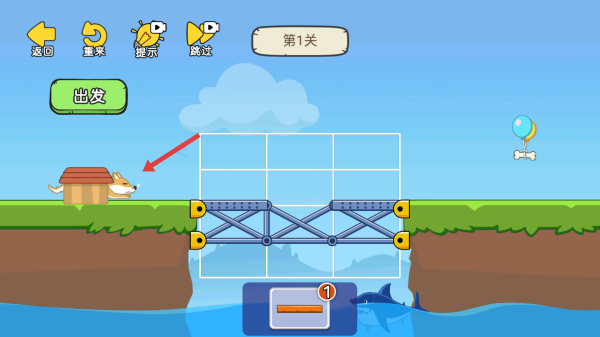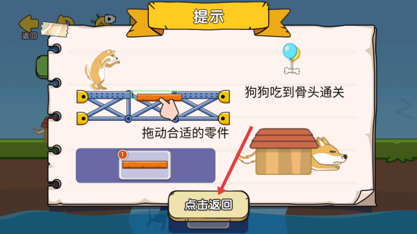 3、搭建闯关:拖动橙色零件补桥,点击“出发”,让狗狗过桥吃骨头。