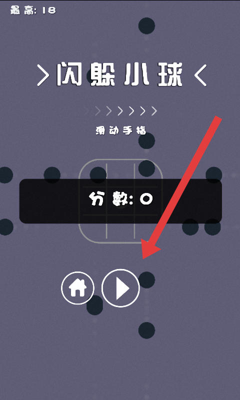 3、当你碰到障碍物就会失败,需要在结算界面点击箭头指向的播放按钮,重新开始闪躲小球游戏。