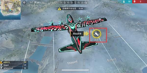 2、进入游戏后会有一段准备时间,倒计时结束后,通过搭乘飞机前往战场,玩家点击跳伞后开始战斗。