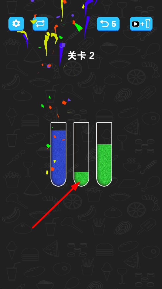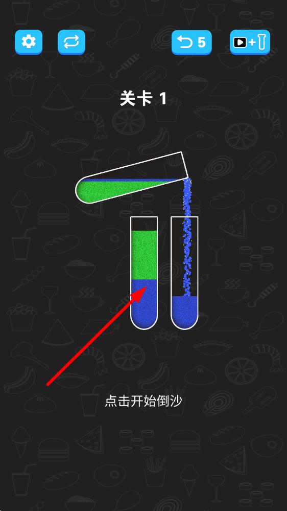 1、进入界面后点击试管顶部倾倒沙子,每次倾倒需确保目标试管有足够空间且颜色匹配,长按可控制倾倒速度。