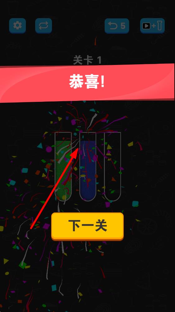 3、将所有颜色沙子成功分类至对应试管即可通关,结算时根据步数与耗时获取星星,解锁「快速倾倒」「空间预览」等辅助道具。